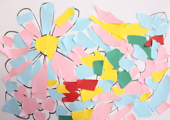 予め作家が花の線画を描いた画用紙(A3)とちぎった色紙を用意し、