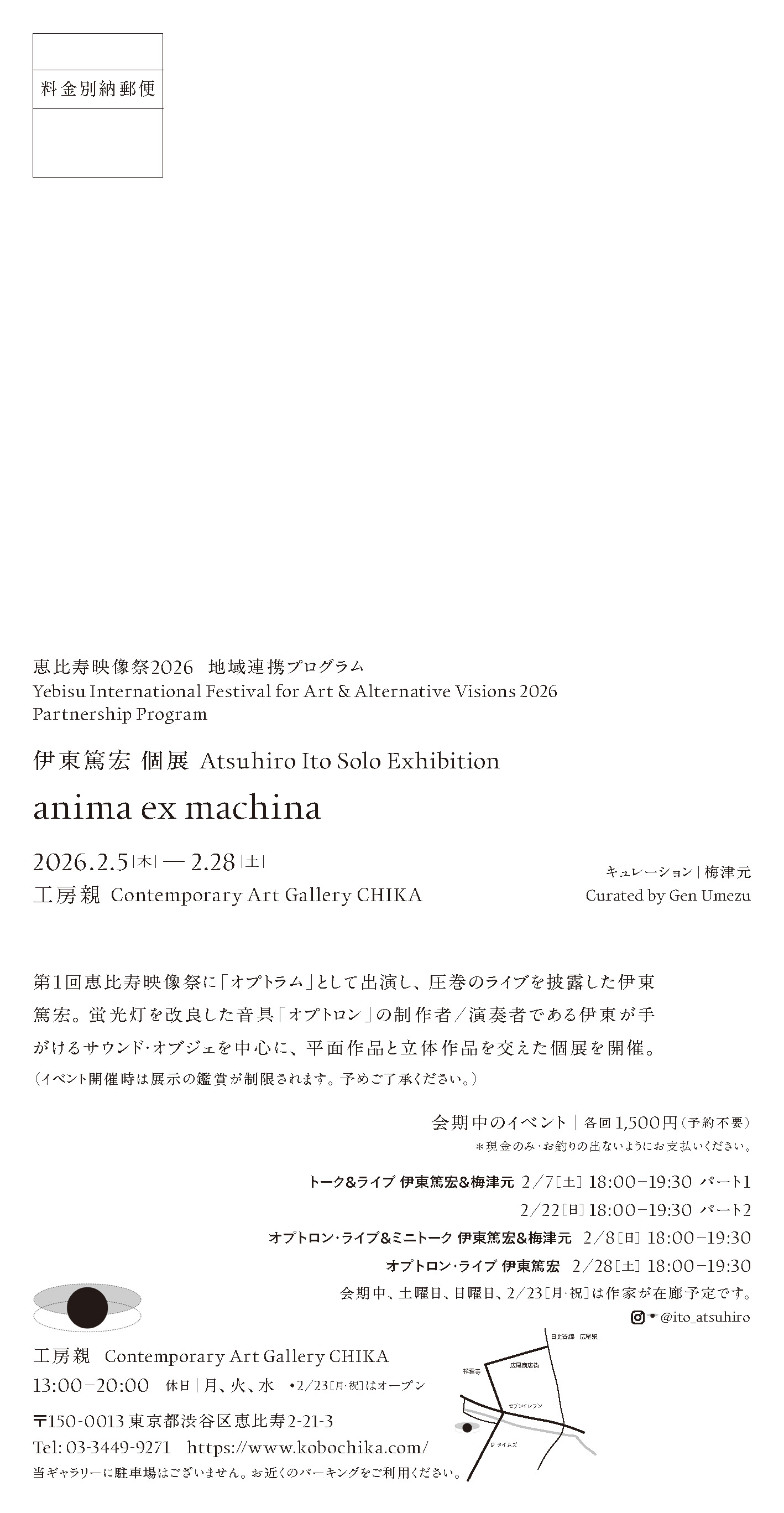 音具「オプトロン」の制作者/演奏者である伊東が手がけるサウンド・オブジェを中心に、平面作品と立体