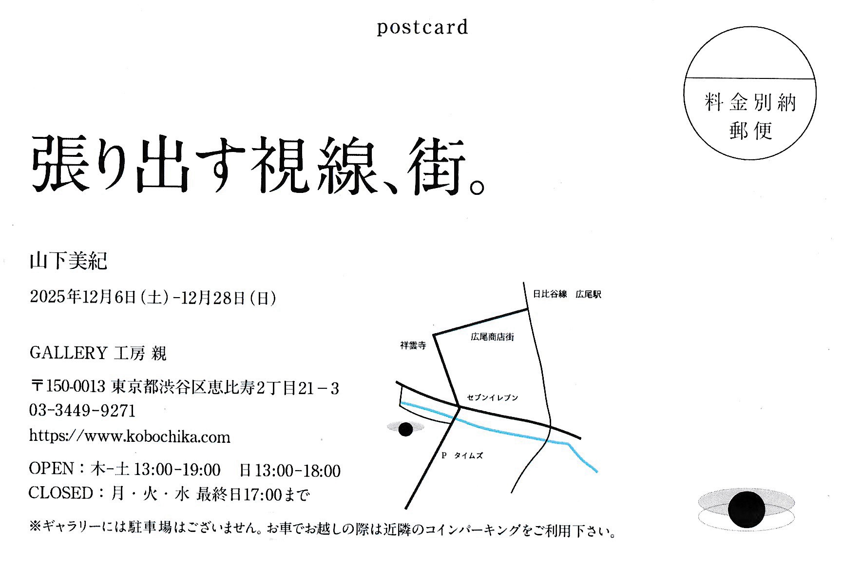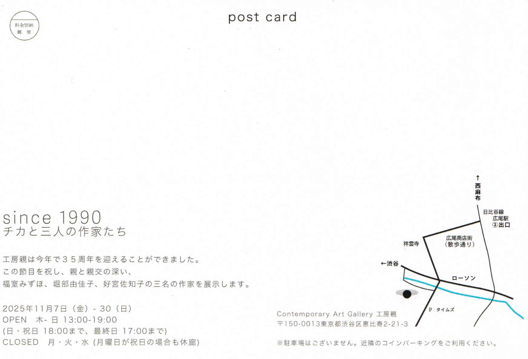 ※ギャラリーに駐車場はございません。お車でお越しの際は近隣のコインパーキングをご利用ください。